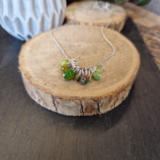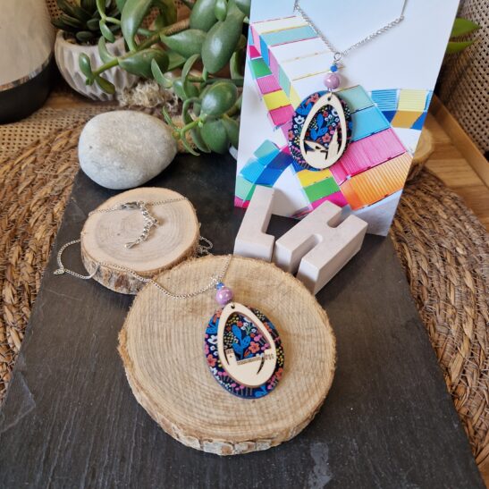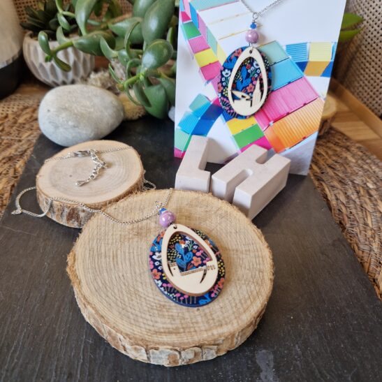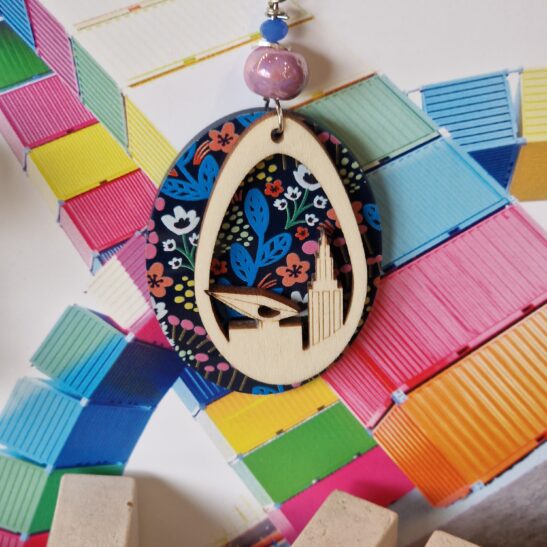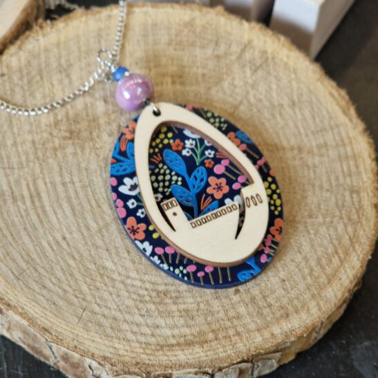 Joli pendentif composé d’une découpe bois aux motifs de l’architecture Havraise et d’un fond acrylique aux jolies fleurs