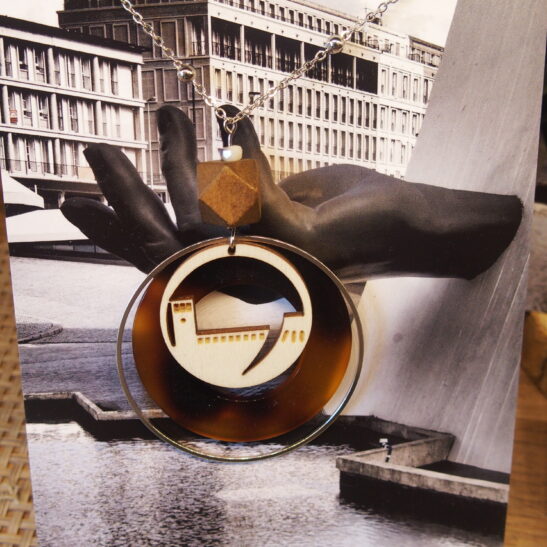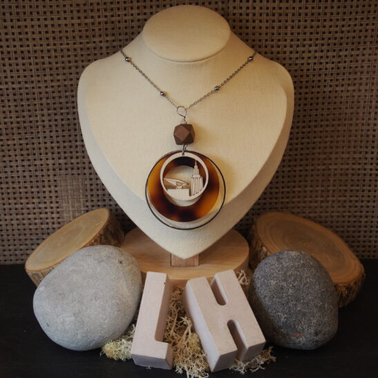 Pendentif composé d’une découpe laser sur bois de peuplier, d’un fond en acrylique marbré façon écaille et d’un anneau grand et fin métallique
