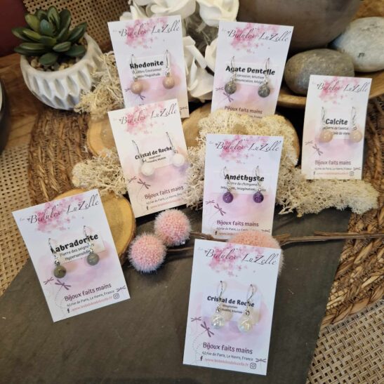 | Pierres Naturelles | Agate dentelle (gris marbré), améthyste (violet), Apatite (bleu-vert), Calcite (saumon), Cristal de Roche (blanc), cristal de roche (gris), cristal de roche(blanc mat), Jaspe vert, Labradorite (gris vert), Lapis Lazuli (bleu), Rhodonite, Tourmaline |