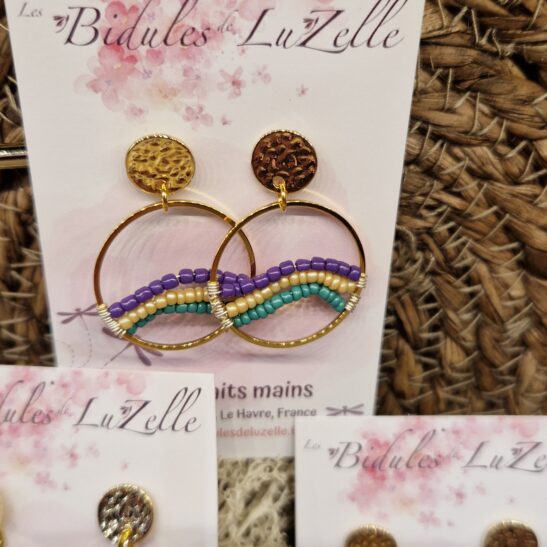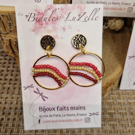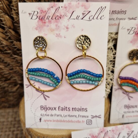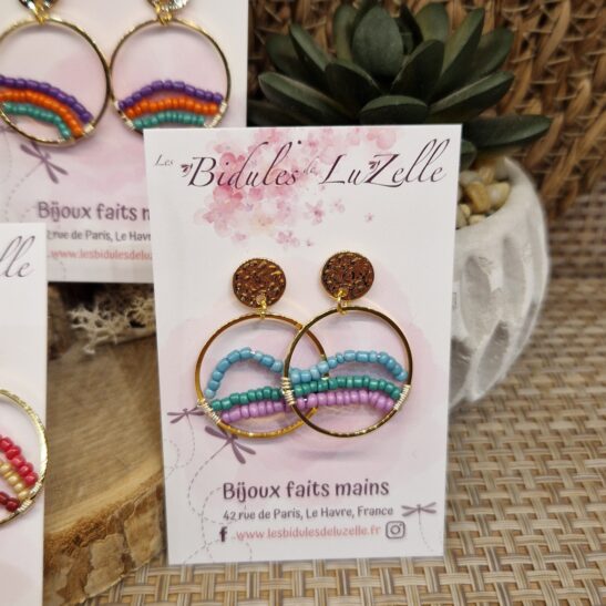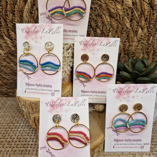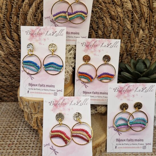 Sur un anneau de 25mm de diamètre, 3 rangées de perles de verre de couleurs assorties