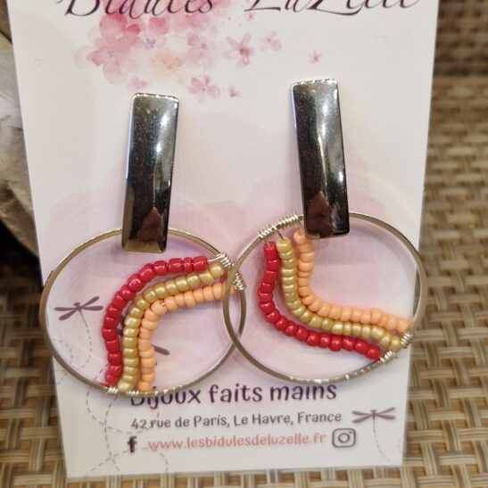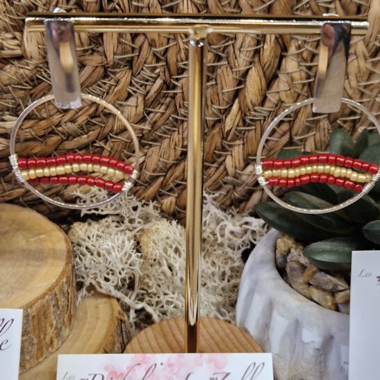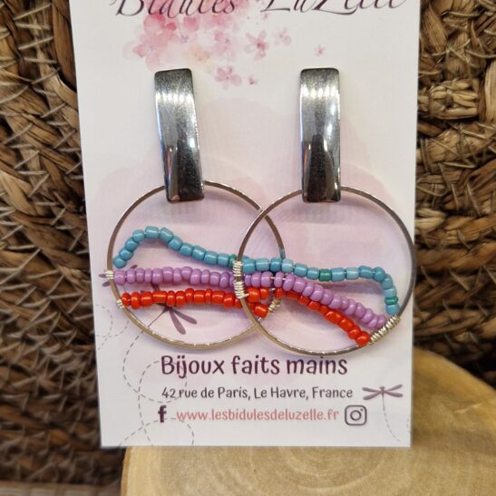 Sur un anneau de 30mm de diamètre, 3 rangées de perles de verre de couleurs assorties