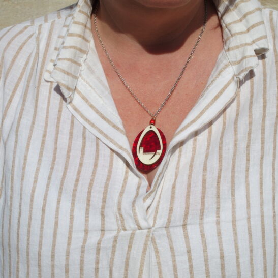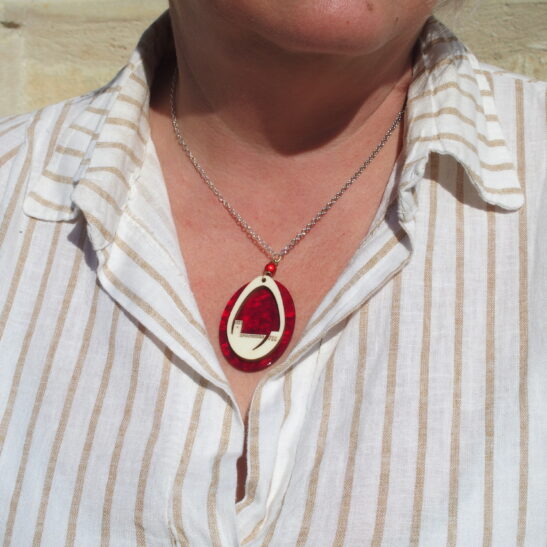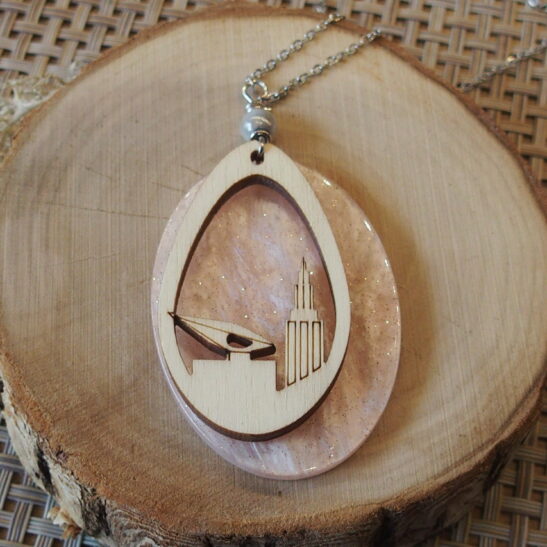 Joli pendentif composé d’une découpe bois aux motifs de l’architecture Havraise et d’un fond acrylique rose pailleté