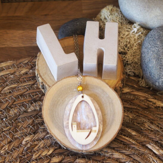 Joli pendentif composé d’une découpe bois aux motifs de l’architecture Havraise et d’un fond acrylique rose pailleté