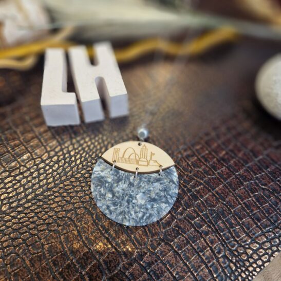 Découpe en bois gravé associé à de l’acrylique grise marbrée