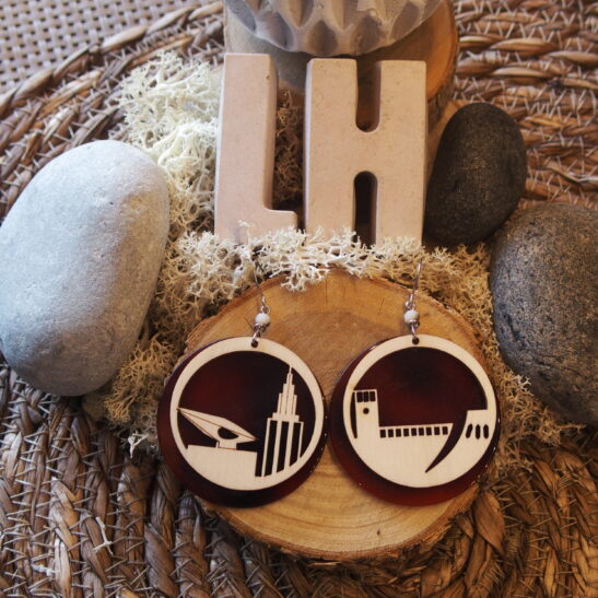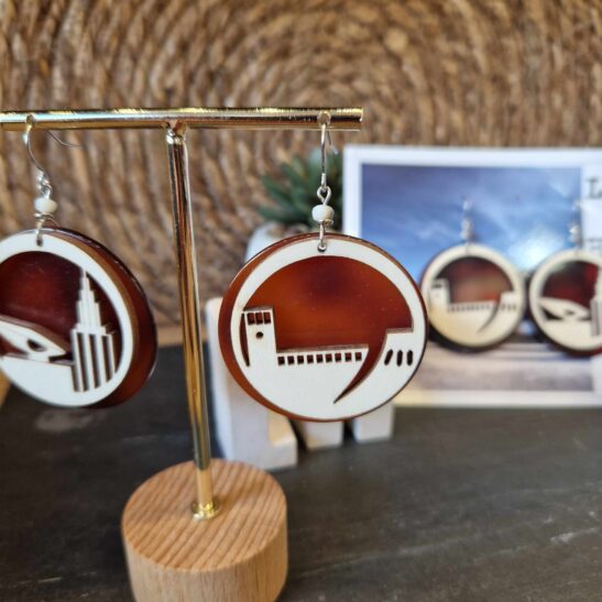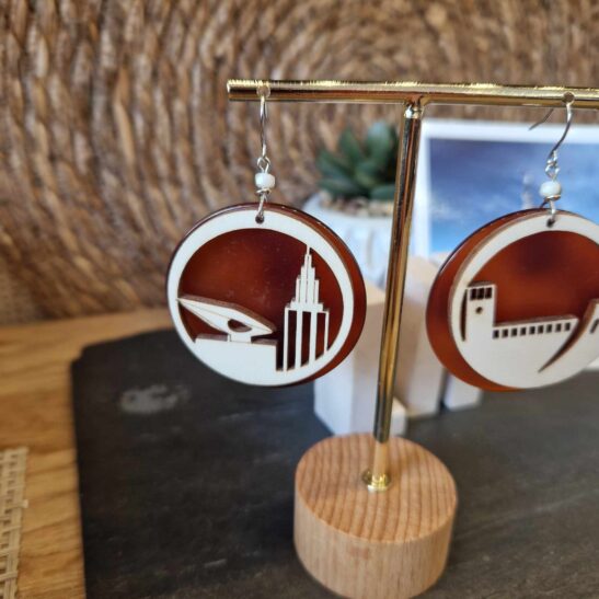 Découpes au laser sur bois de peuplier, les bâtiments incontournables du Havre se détachent sur un fond écaille brun